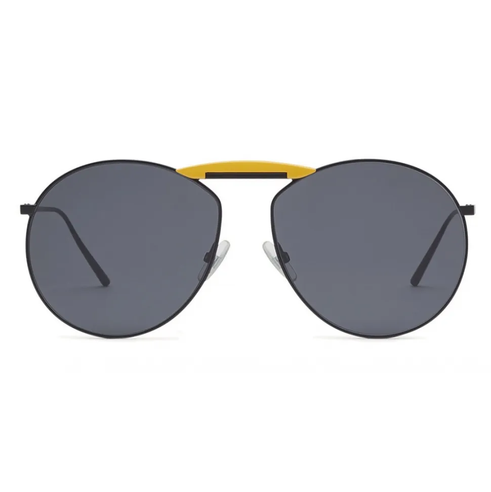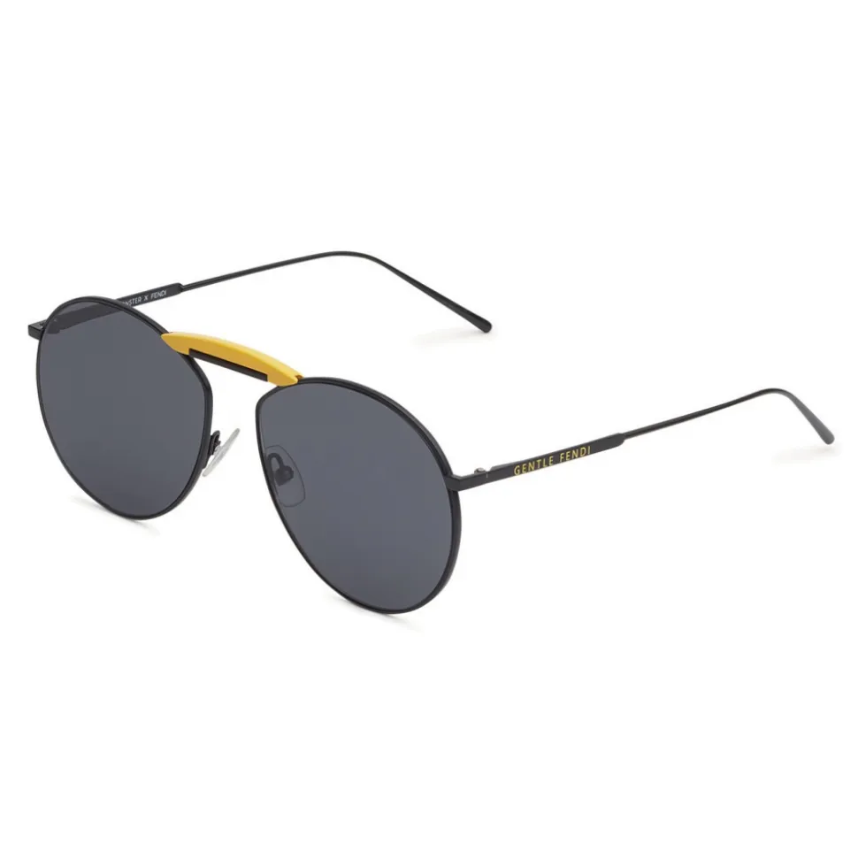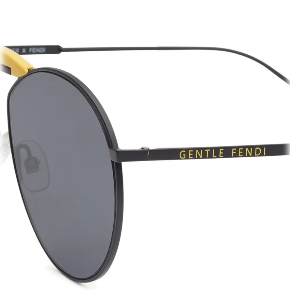 Born in collaboration with Gentle Monster, ultralight sunglasses with a rounded line. The frame is made of black metal with a matte finish, with a contrasting yellow insert on the bridge. The thin temples have the Gentle Fendi lettering in yellow and the signature of the laser-printed collaboration inside. Adjustable nose pads. Anti-glare dark gray lenses. Made in Italy.