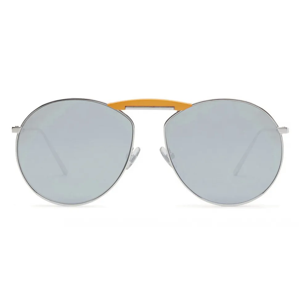 Born in collaboration with Gentle Monster, ultralight sunglasses with a rounded line. The frame is made of palladium-colored metal, with a contrasting orange insert on the bridge. The thin temples have the Gentle Fendi lettering in yellow and the signature of the laser-printed collaboration inside. Adjustable nose pads. Antiglare silver mirrored lenses. Made in Italy.