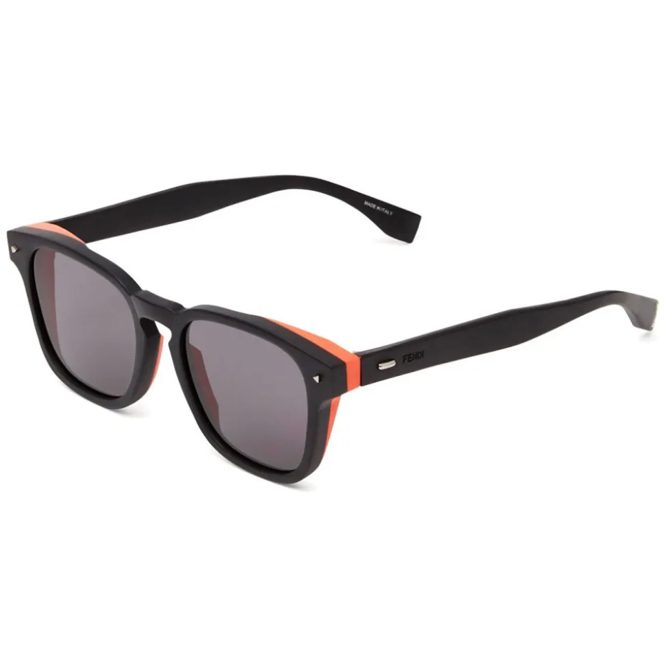 I See You sunglasses with a squared line, made of opaque black acetate. The frame with a bold (bold) and easy-to-wear design is characterized by contrasting orange opaque spoons and nose pads and by the customization given by the iconic Bag Bugs eye on the terminals. Metal stich and Fendi logo engraved on the rod. Gray lenses.