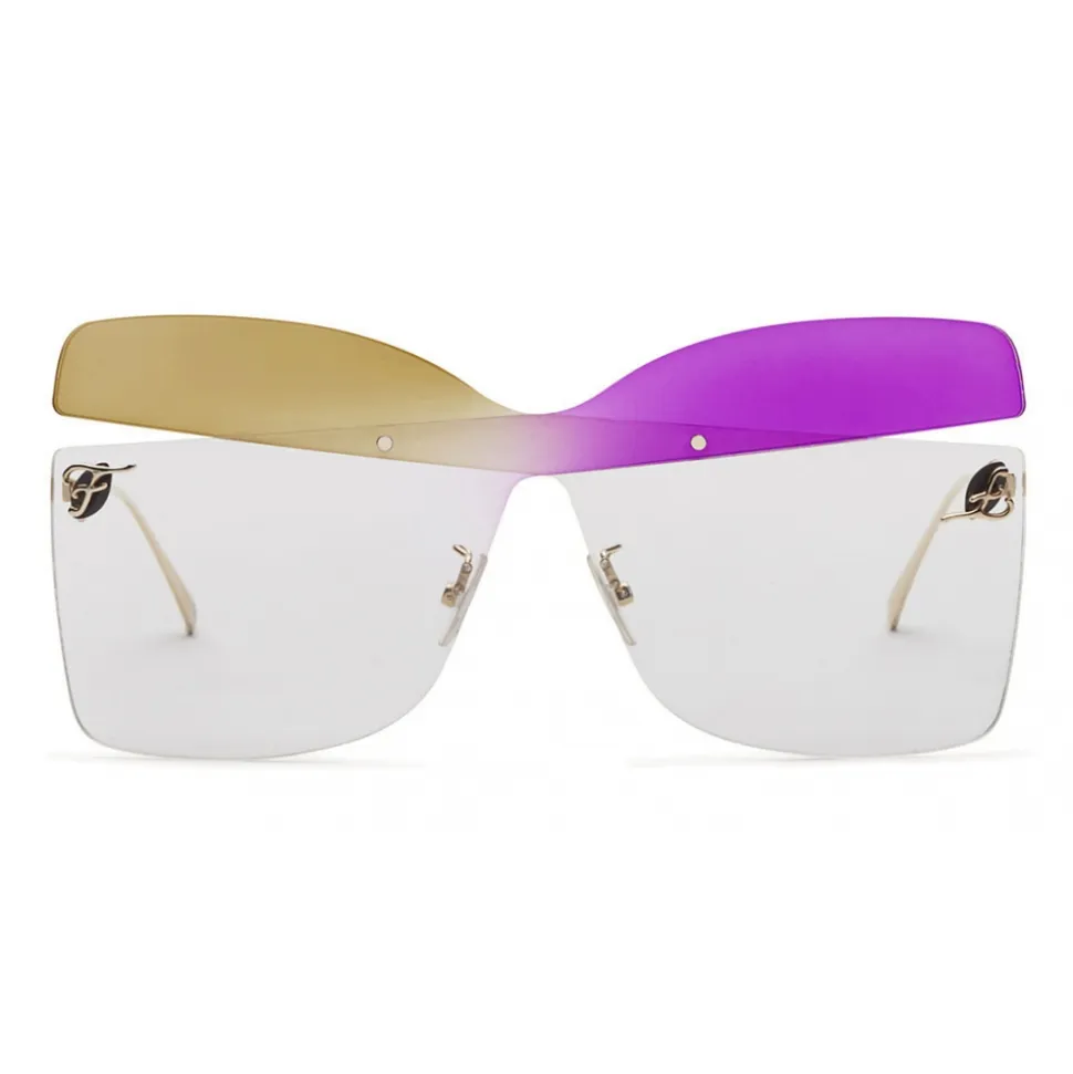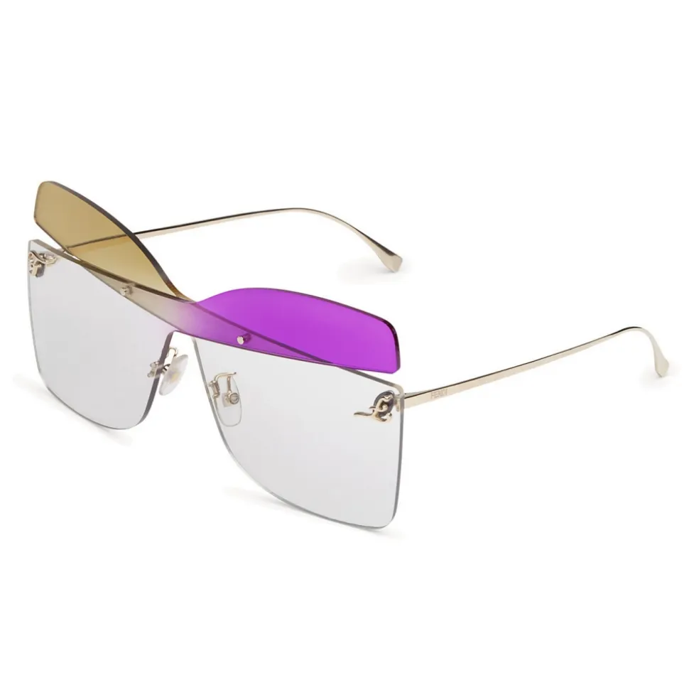 Karligraphy sunglasses, presented at the Fall Winter 2019 Fashion Show. The rimless design combines a structured shape with an extreme sense of lightness. The front is made up of two overlapping lenses creating a butterfly silhouette, with ciliary elements in tobacco and purple tones. Thin rods in metal with a gold finish, rivets with the distinctive “FF Karligraphy” shape and adjustable nose pads. Gray gradient lenses. Made in Italy.
