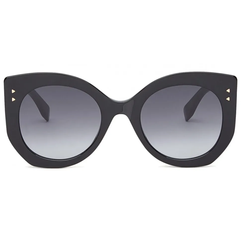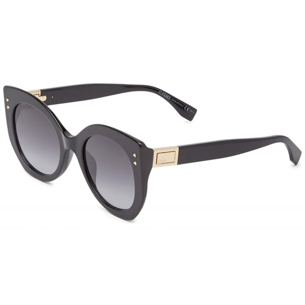 Peekaboo sunglasses with Butterfly shape in black acetate. The sophisticated design is highlighted by the geometric cuts of the frame. Gold hinge with engraved Fendi logo, inspired by the iconic Fendi bag: the Peekaboo. Internal customization of the auction with hot stamped “Peekaboo”. Gray gradient lenses.