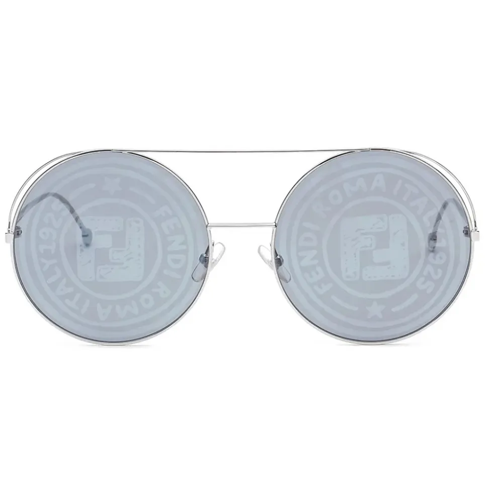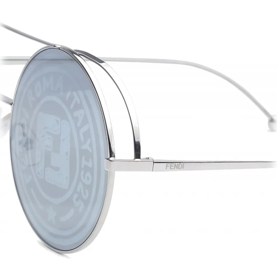 Round oversized sunglasses with palladium-color metal mount. Gray lenses with silver mirror-effect Fendi Roma stamp. Adjustable nose pads. Made in Italy.