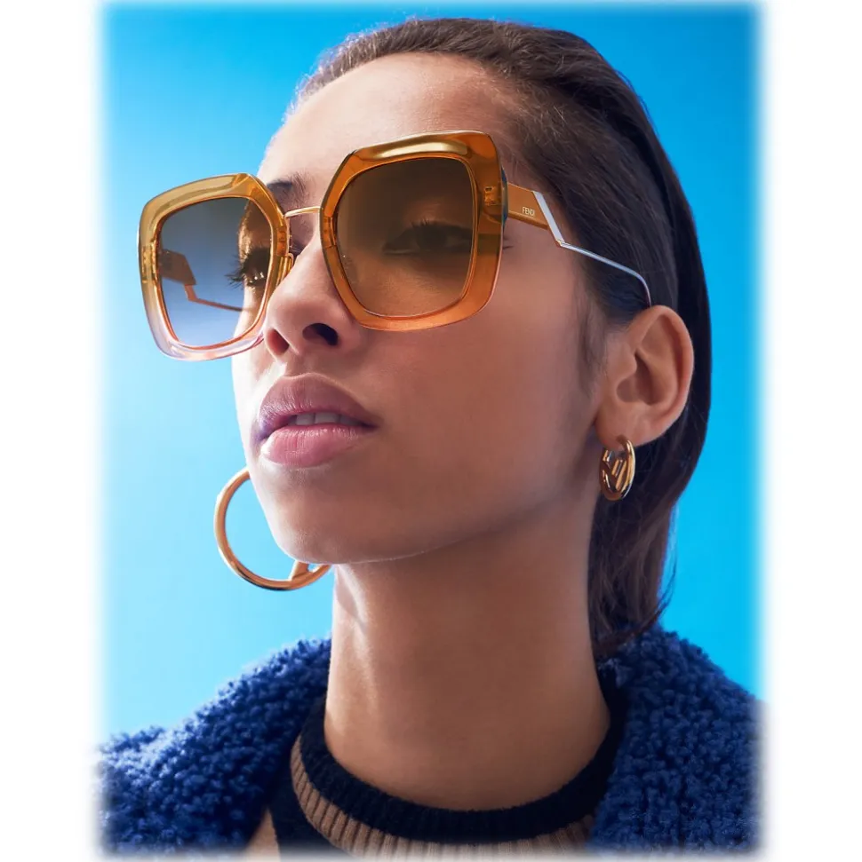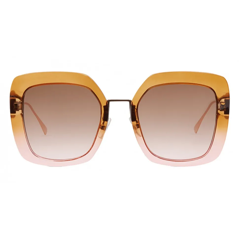 Tropical Shine sunglasses with an oversized squared shape, inspired by the geometries of Italian Futurism. The model has adjustable nose pads and metal rods with an iconic angled shape. Made of acetate with a dégradé effect in shades of brown and pink. The metal rods with rose gold finish are enriched by a brown color block detail and personalized with the Fendi logo. Brown and pink gradient lenses.