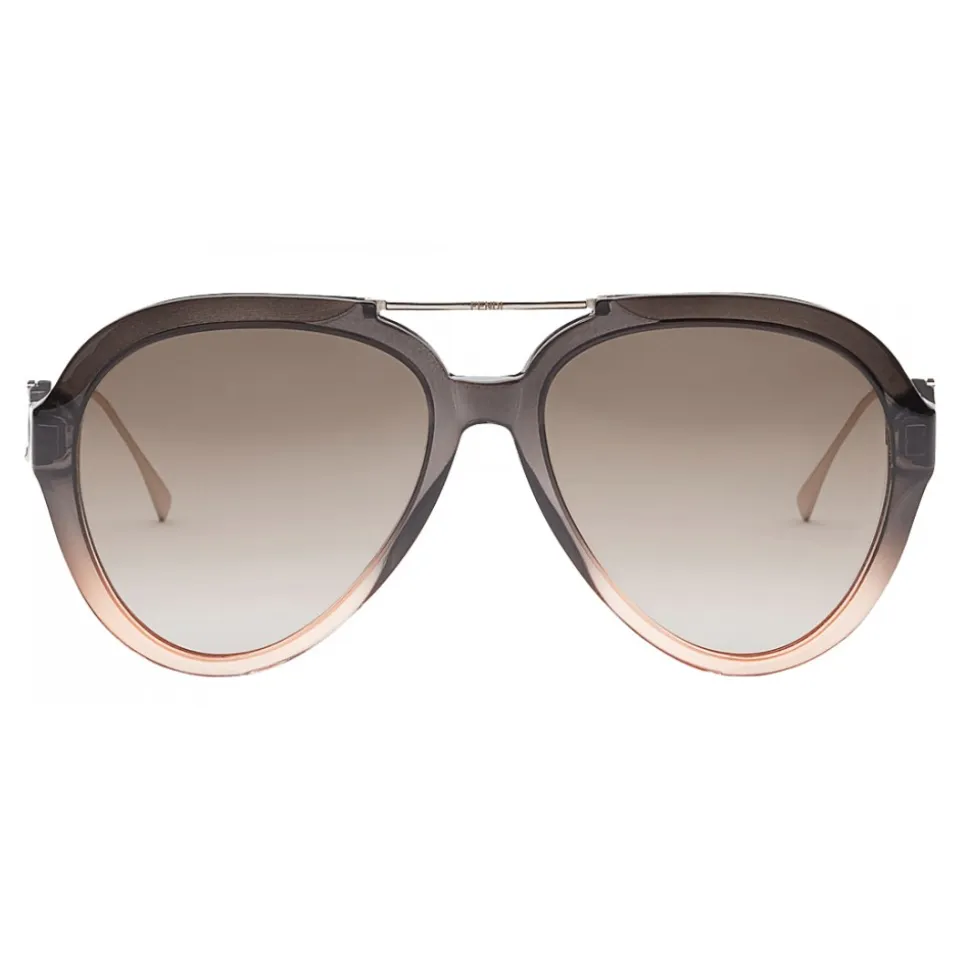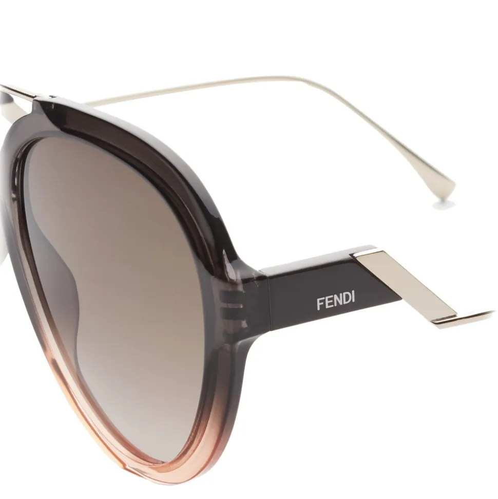 Tropical Shine sunglasses with an oversized aviator shape. The model has a double bridge and metal rods with an iconic angled shape. Made of acetate with a dégradé effect in shades of gray and peach pink. The metal rods with golden finish are enriched by a gray color block detail, personalized with the silver Fendi logo. Brown gradient lenses.