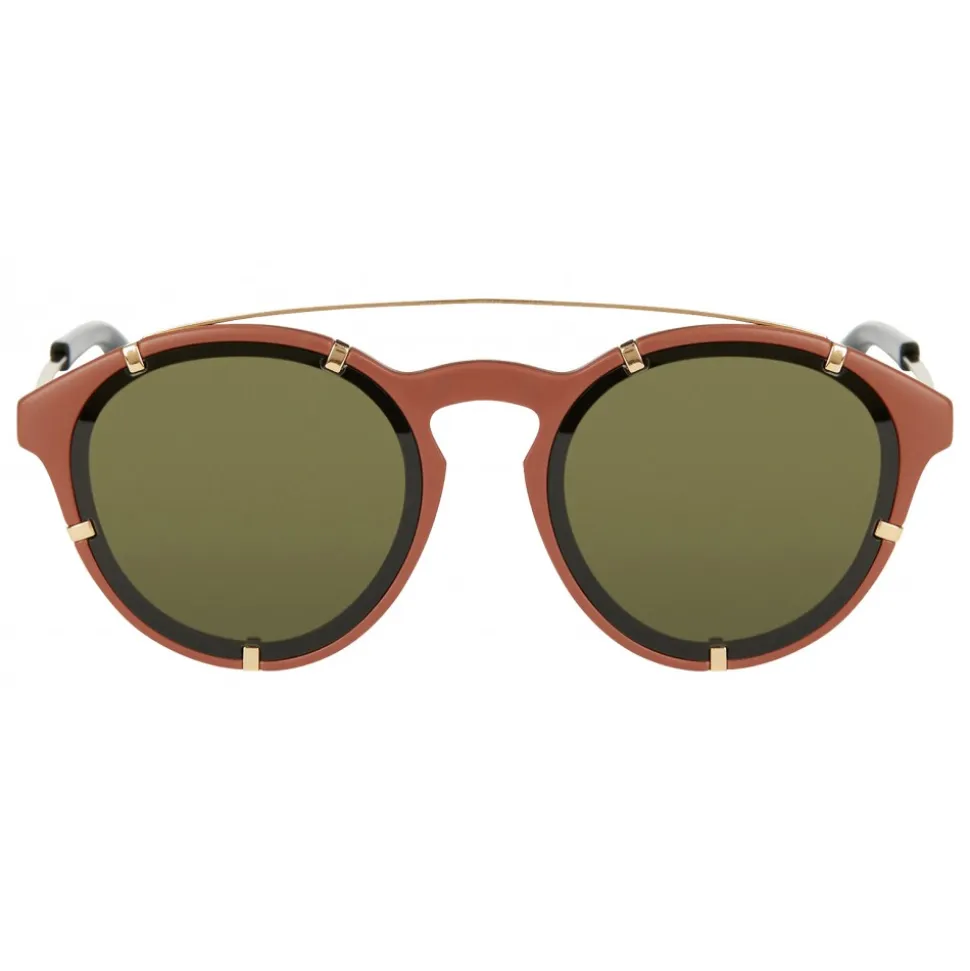 Opaque brown acetate sunglasses with bridge and metal rods with gold finish and brown lenses. Terminals in black acetate.