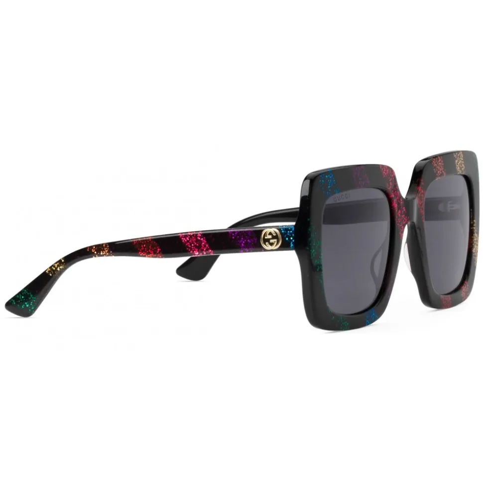 Black acetate temples with rainbow glitter stripe and gold metal GG