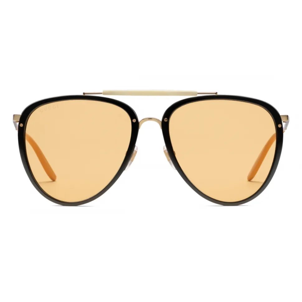 Imbued with a vintage inspired feel, the yellow lens is encircled within a black acetate frame, backed by a gold-toned metal structure. The classic aviator design is enriched by a horn effect acetate detail at the top bar, while the Gucci script enhances the gold metal temples.