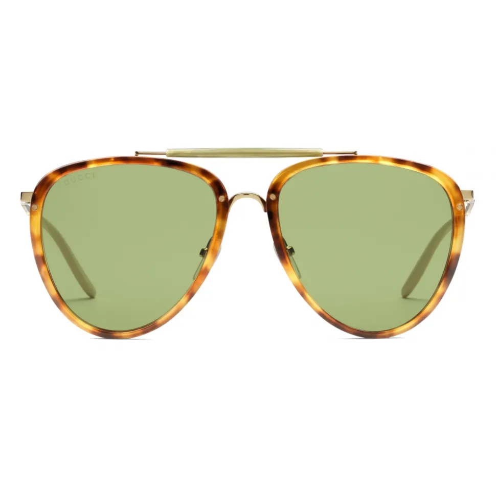 Imbued with a vintage inspired feel, the green lens is encircled within a tortoiseshell acetate frame, backed by a gold-toned metal structure. The classic aviator design is enriched by a green horn effect acetate detail at the top bar, while the Gucci script enhances the gold metal temples.