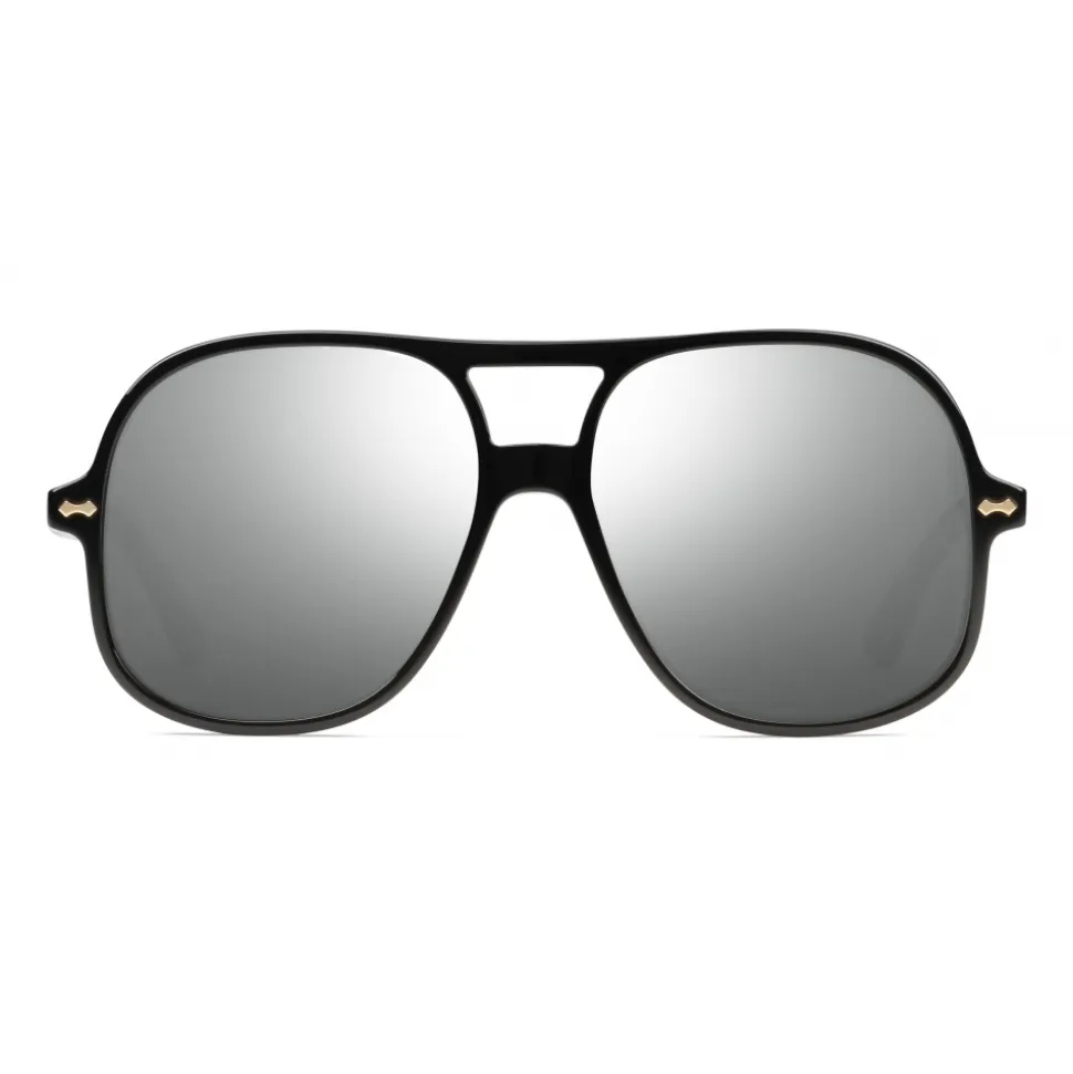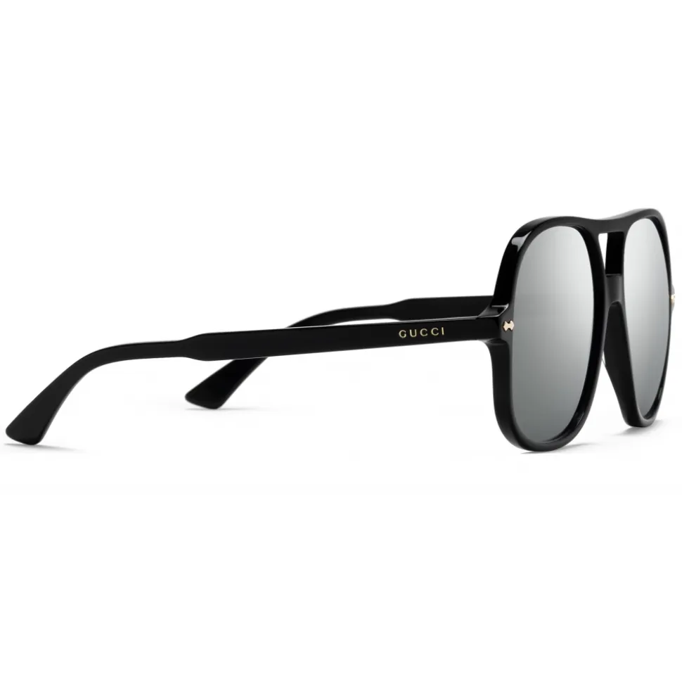 These aviator sunglasses are presented in black acetate and enhanced by metal rivets. A grey and white mirror lens creates a game of reflections, adding dimension to the classic shape, while the Gucci script decorates the temples.