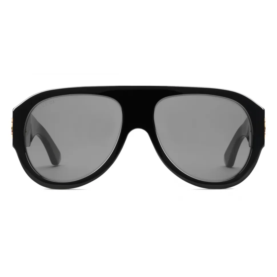 Crafted from shiny black acetate, the bold aviator sunglasses feature oversize gold-toned rivets and Gucci script engraved on the temples. The yellow acetate nose pad adds a playful contrast, while grey lenses complete the design.