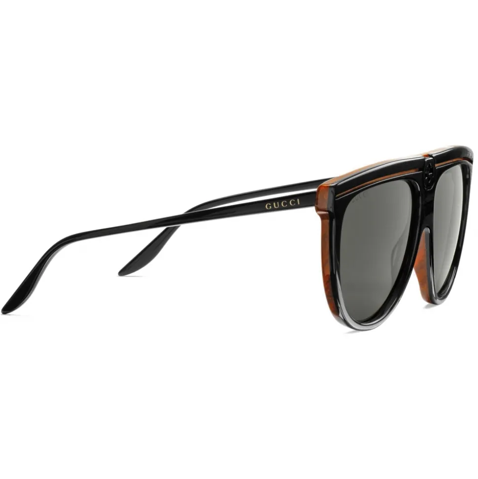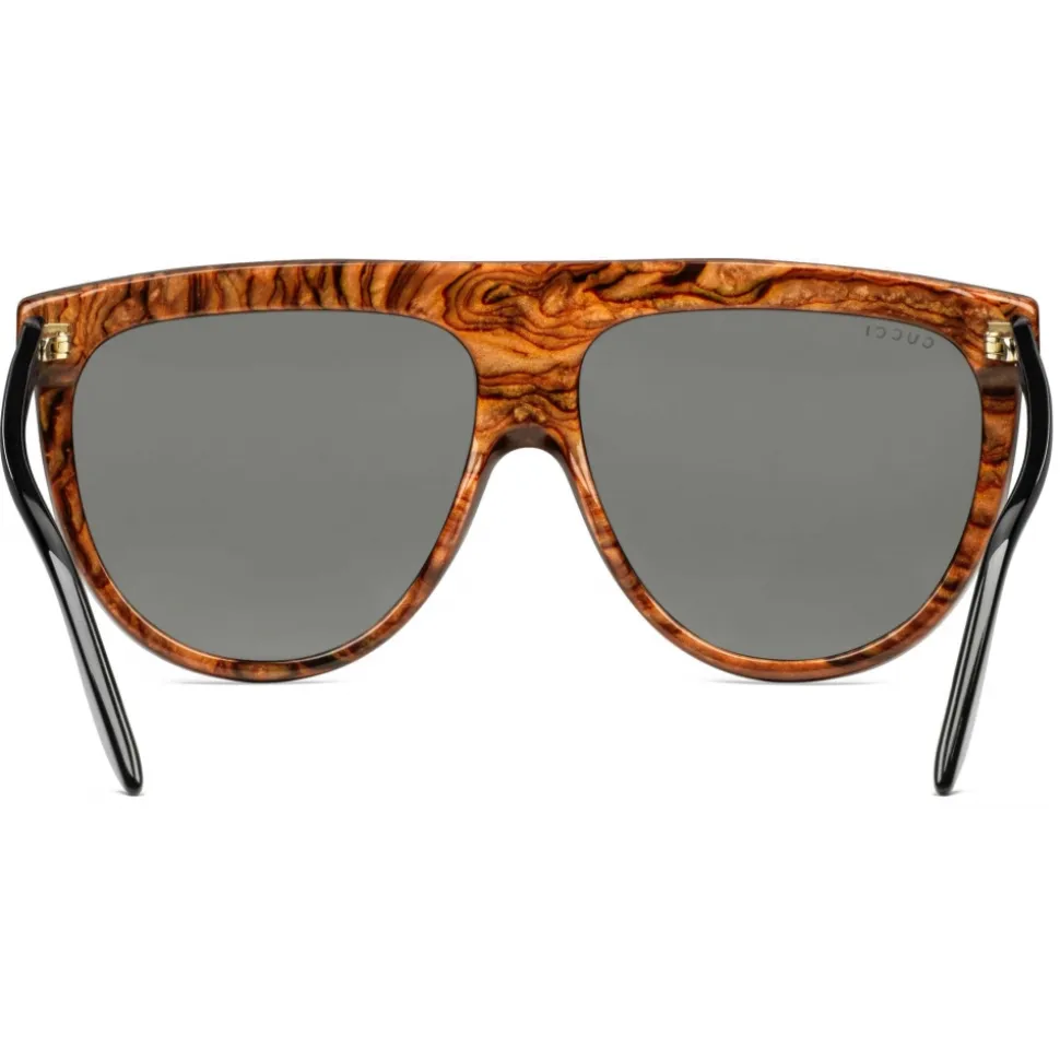Slightly oversize aviator frames are decorated with contrast inlaid brown details across the front and sides. A graphic Interlocking G logo highlights the frame above the nose bridge, while the connection to the House is further strengthened with a Gucci logo along the thin temples.