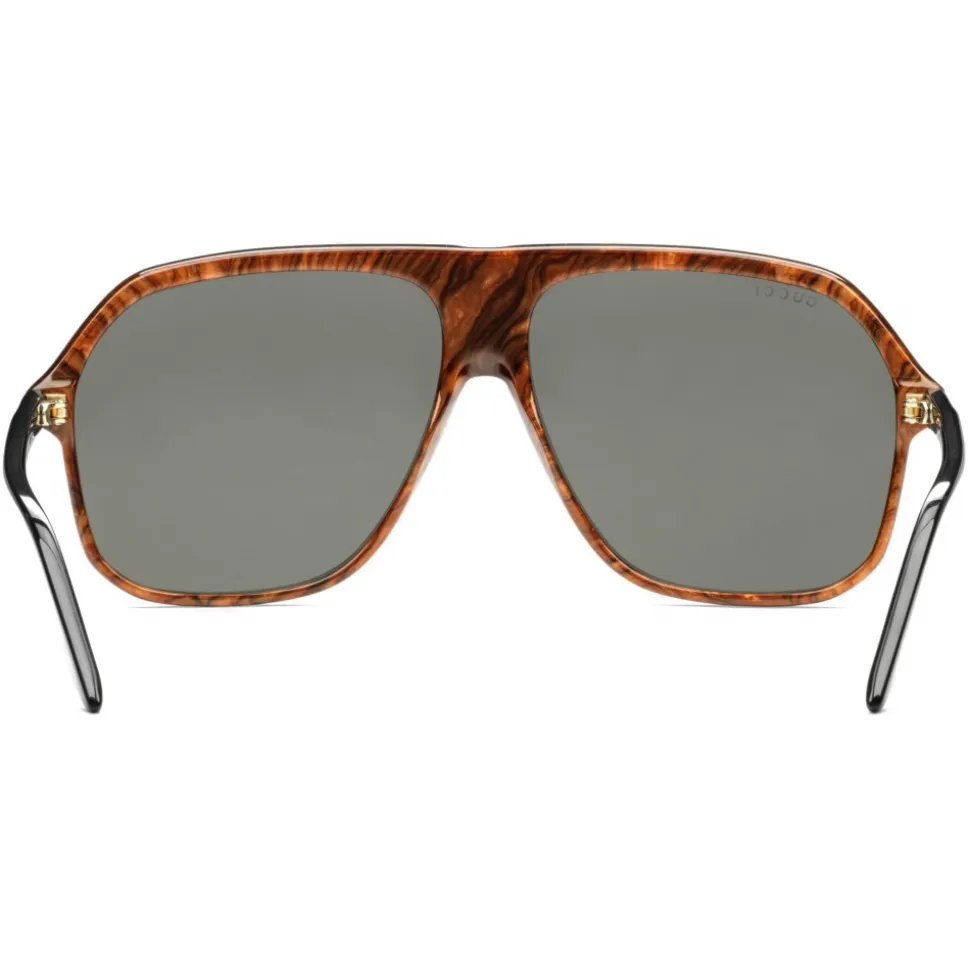 These ’80s inspired aviator frames are decorated with contrast inlaid brown details across the front and sides. A graphic Interlocking G logo highlights the front above the nose bridge, while the connection to the House is further strengthened with the Gucci logo along the thin temples.