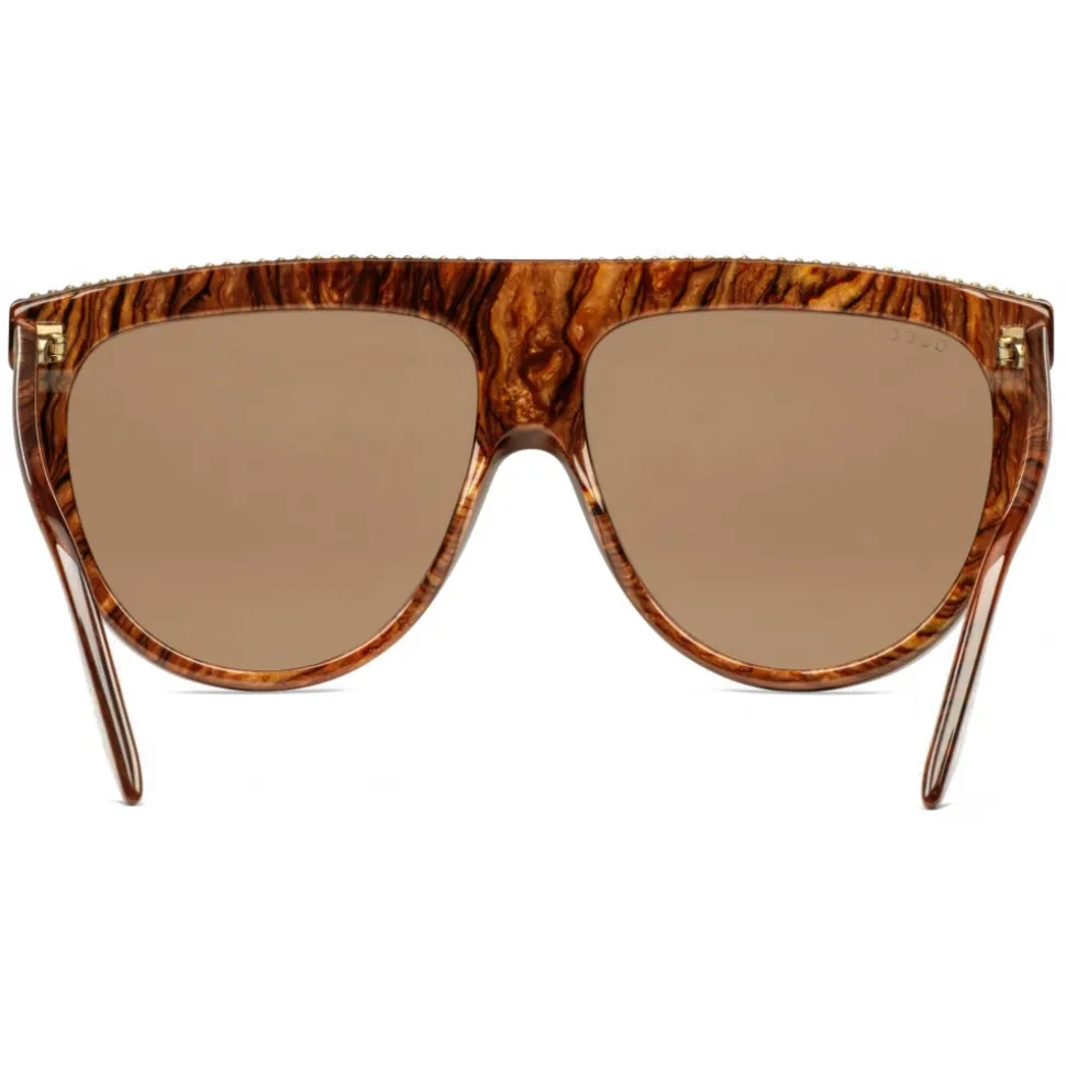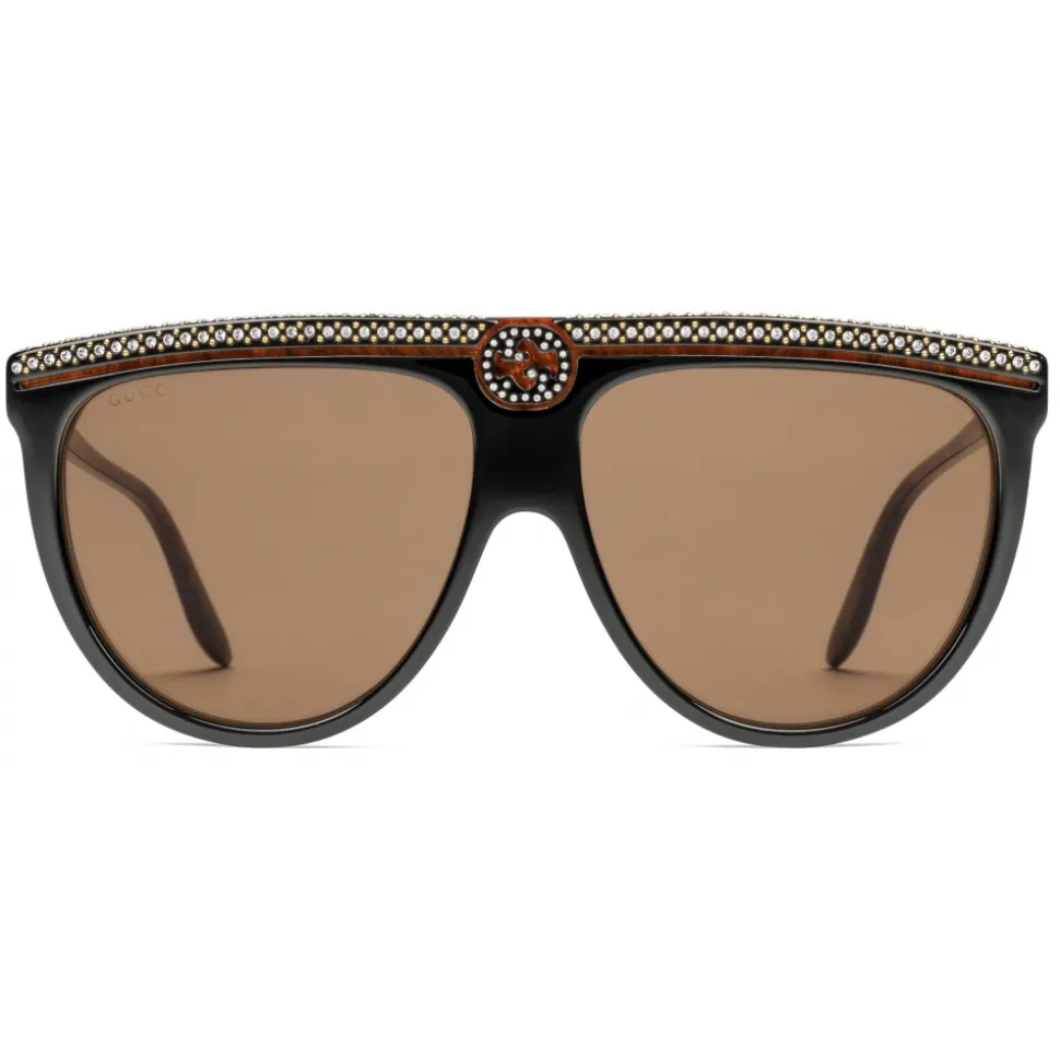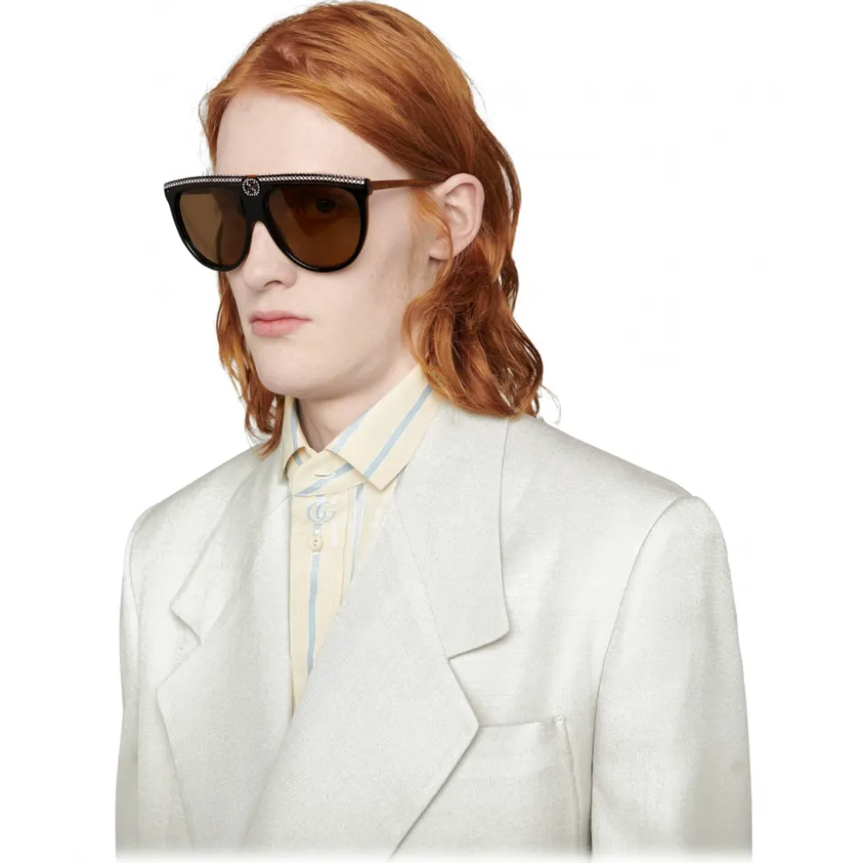 Slightly oversize aviator frames are decorated with contrast inlaid brown details across the front and sides. Gold-toned studs and crystals add a punk inspired element to the shape. A graphic Interlocking G detail highlights the front above the nose bridge, while the connection to the House is further strengthened with a Gucci logo along the thin temples.