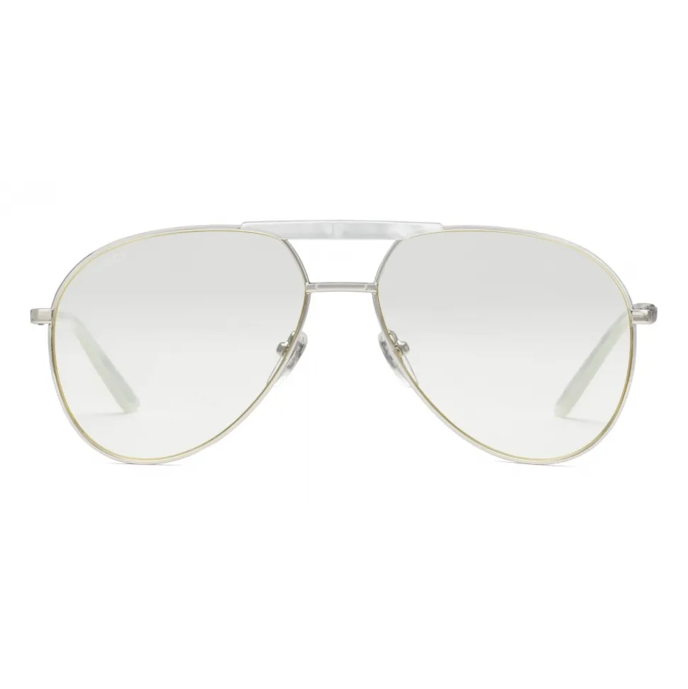 Presented in silver-toned metal, these aviator glasses are designed with a mother of pearl effect acetate detail enhancing the top bar. Transparent lenses complement the timeless design.