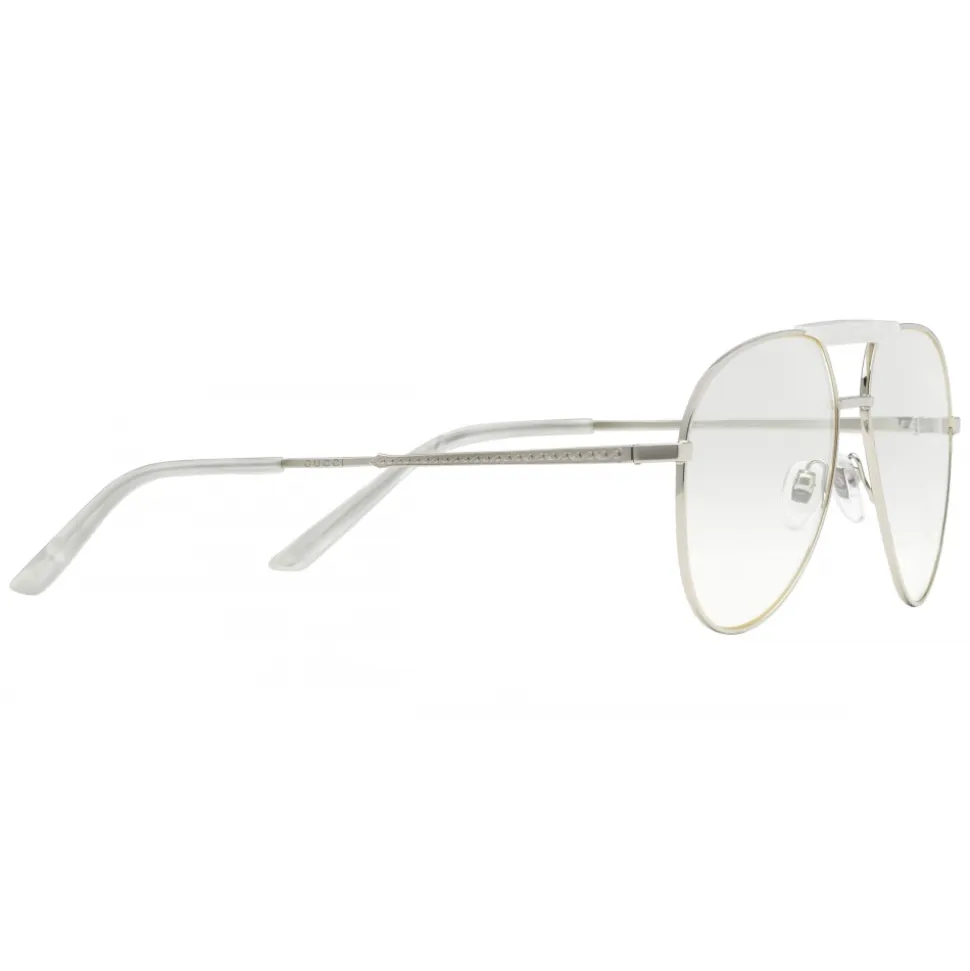 Silver metal temples with Gucci script and mother of pearl effect acetate tips