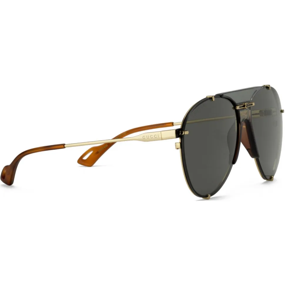 Eighties inspired shape and unexpected details define a new design for Spring Summer 2020. The classic metal frame is further enriched with colored details along the nose bridge, giving the shape an unexpected edge. Gucci engraved gold metal temples complete the shades, ending in acetate tips with a cut-out through which a chain or neck bow can be attached for an unconventional take.