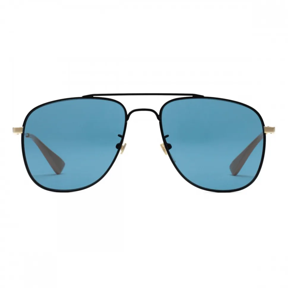 A black metal frame defines these aviator sunglasses, in a delicate game of contrasts with the blue petrol lenses. Enriched by the GG detail, the gold-colored metal temples have acetate ends decorated with a small bee – a symbol from the Gucci archives of the 1970s.