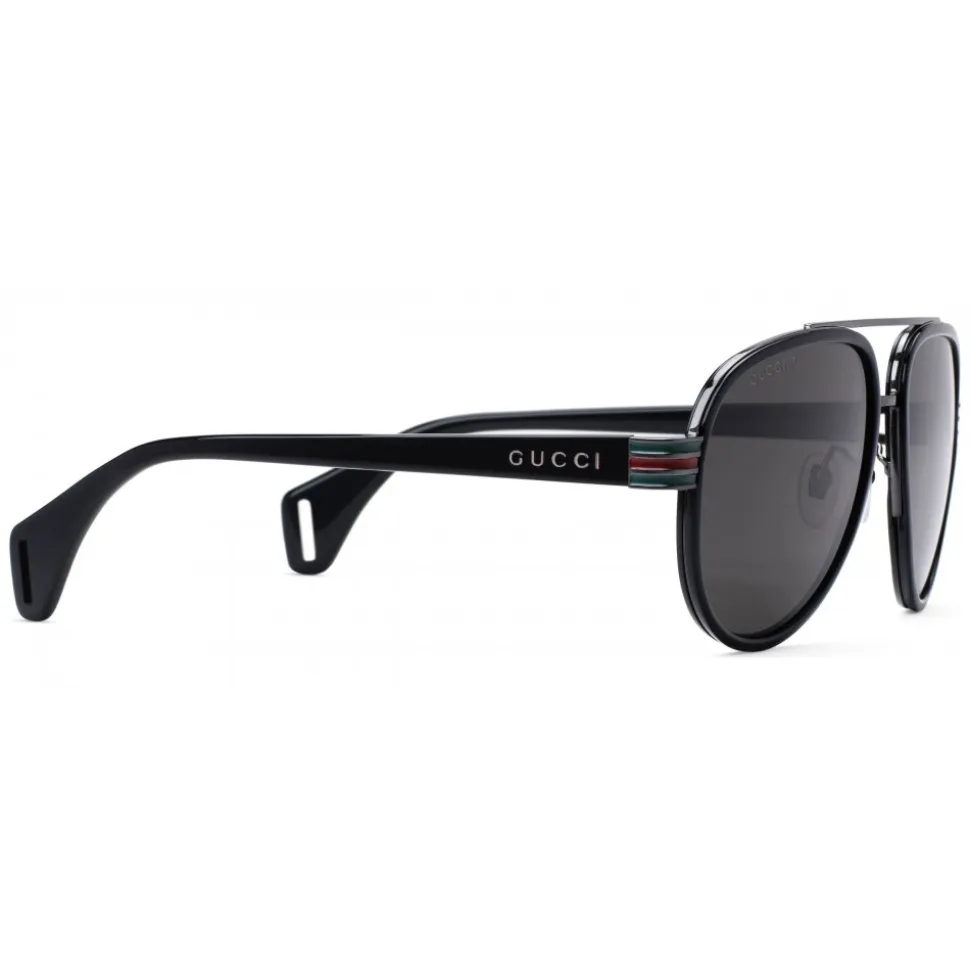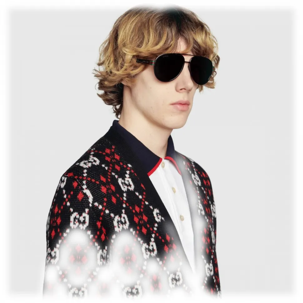 Historical symbol inspired by the equestrian tradition of the House, the Web changes its face every season. In these aviator sunglasses, the ribbon is transformed into an enamelled detail that decorates the ends that connect the frame to the temples. Made of black acetate, this model is illuminated by metal profiles and completed by the metal upper bar. A slit characterizes the terminals.