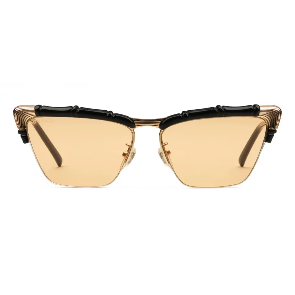 Black cat-eye frames are carved into a bamboo effect design with gold-toned metal details, complemented by yellow lenses. Bamboo was originally incorporated into Gucci’s collections in 1947 and soon became one of the most recognizable House emblems, often reworked in unexpected ways.