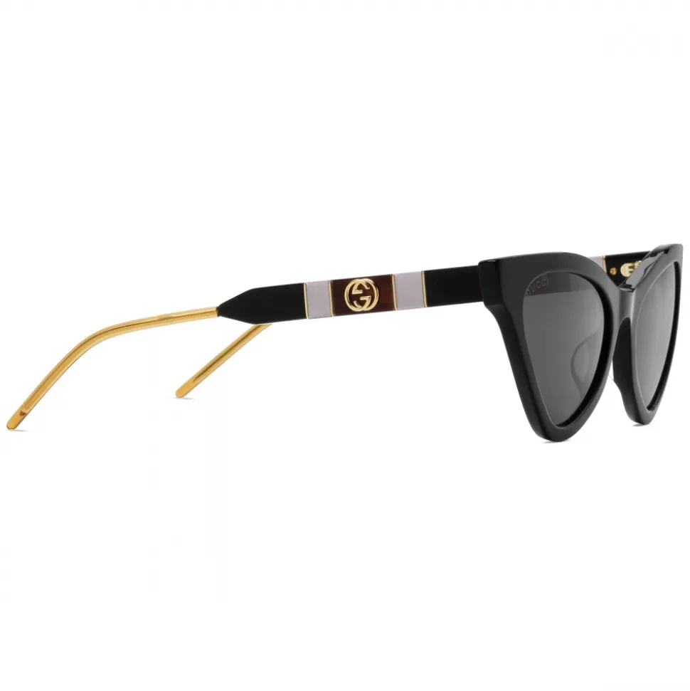 Influenced by the coveted styles of the ’50s and ’60s, the cat eye glasses have a shaped frame with an upsweep at the outer edges in black acetate that continues to the temples, ending in gold metal tips. Each side is enriched with a Web effect detail in pearlized pink and tortoiseshell acetate, topped with an Interlocking G detail.