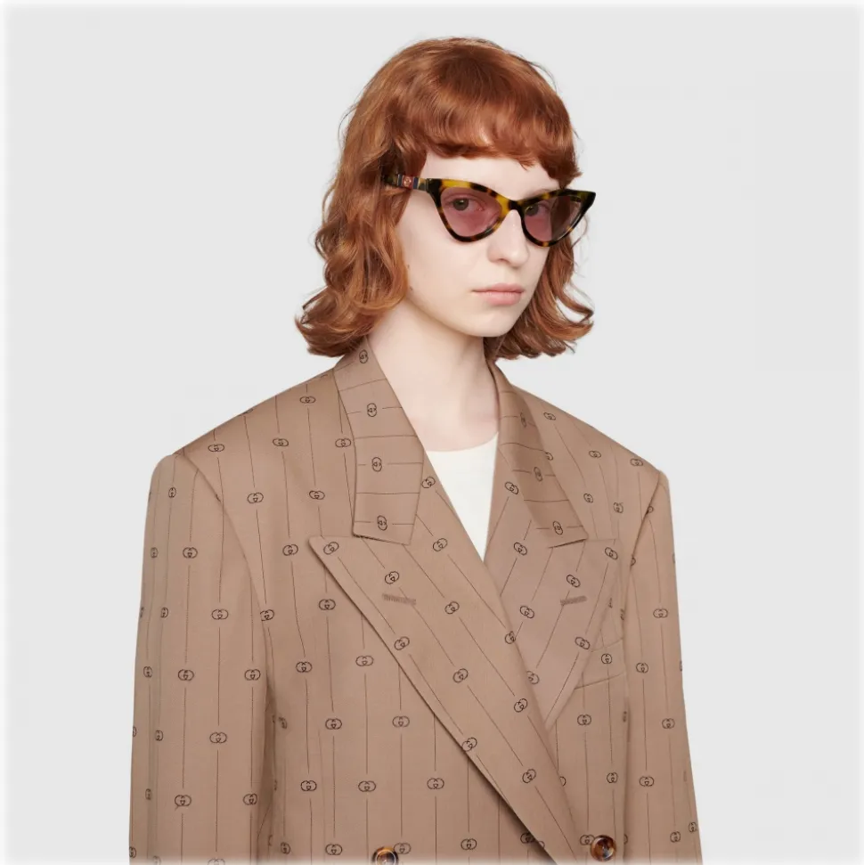 Influenced by the coveted styles of the ’50s and ’60s, the cat eye glasses have a shaped frame with an upsweep at the outer edges in tortoiseshell acetate that continues to the temples, ending in gold metal tips. Each side is enriched with a Web effect detail in pearlized blue and burgundy acetate, topped with an Interlocking G detail.