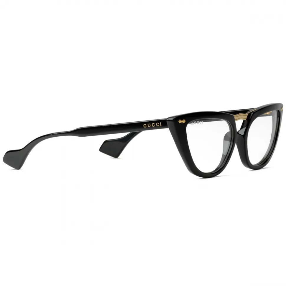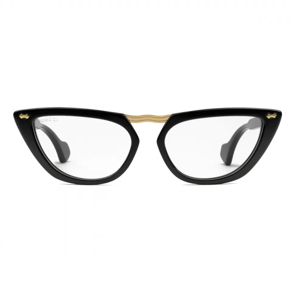 A sophisticated shape, the classic cat-eye glasses are reimagined in a mix of materials, with a gold-toned metal bridge contrasting the bold black acetate frame. The Gucci logo further enriches the temples.