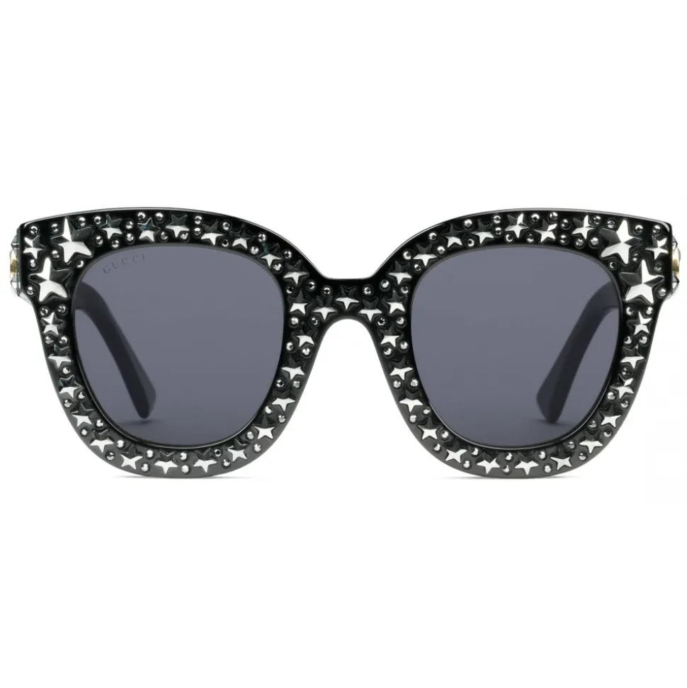 Black acetate temples with silver star-shaped crystals and metal interlocking G