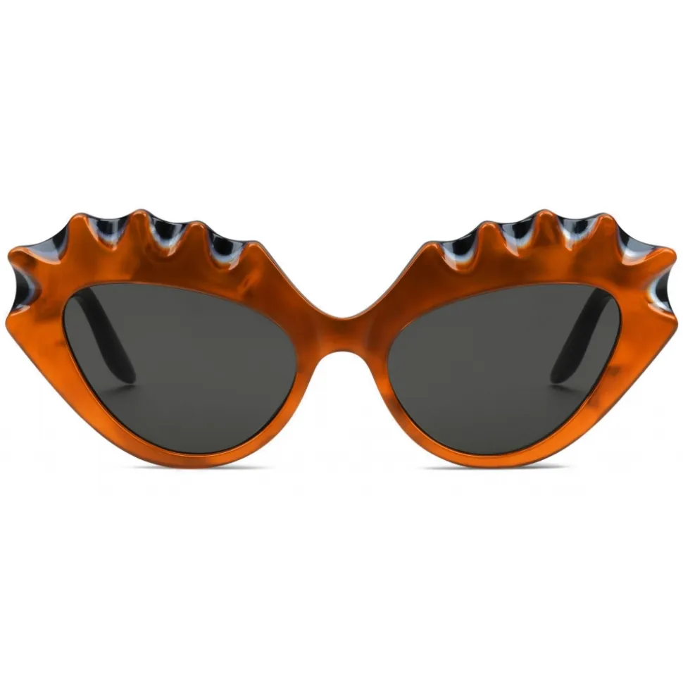 A pair of extravagant cat-eye sunglasses inspired by designs from the ’50s and ’60s. The shades feature a bold frame with spoked edges crafted from orange mother of pearl effect acetate, standing against light gray and black acetate layers. An emblematic logo of the House, the Interlocking G detail enriches the temples, while gray lenses complete the design.