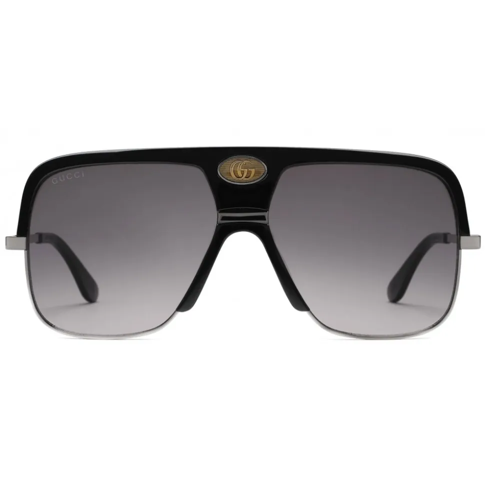 With its Double G detail, the enamel-finished guilloché oval on the bridge is reminiscent of the cigarette holder typical of vintage aviator models. The navigator sunglasses are presented in black acetate, with gray gradient lenses and ruthenium metal details.