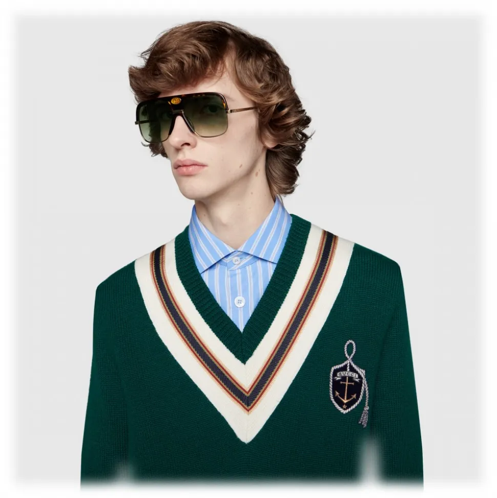 With its Double G detail, the enamel-finished guilloché oval on the bridge is reminiscent of the cigarette holder typical of vintage aviator models. The navigator sunglasses are presented in black acetate, with gray gradient lenses and ruthenium metal details.