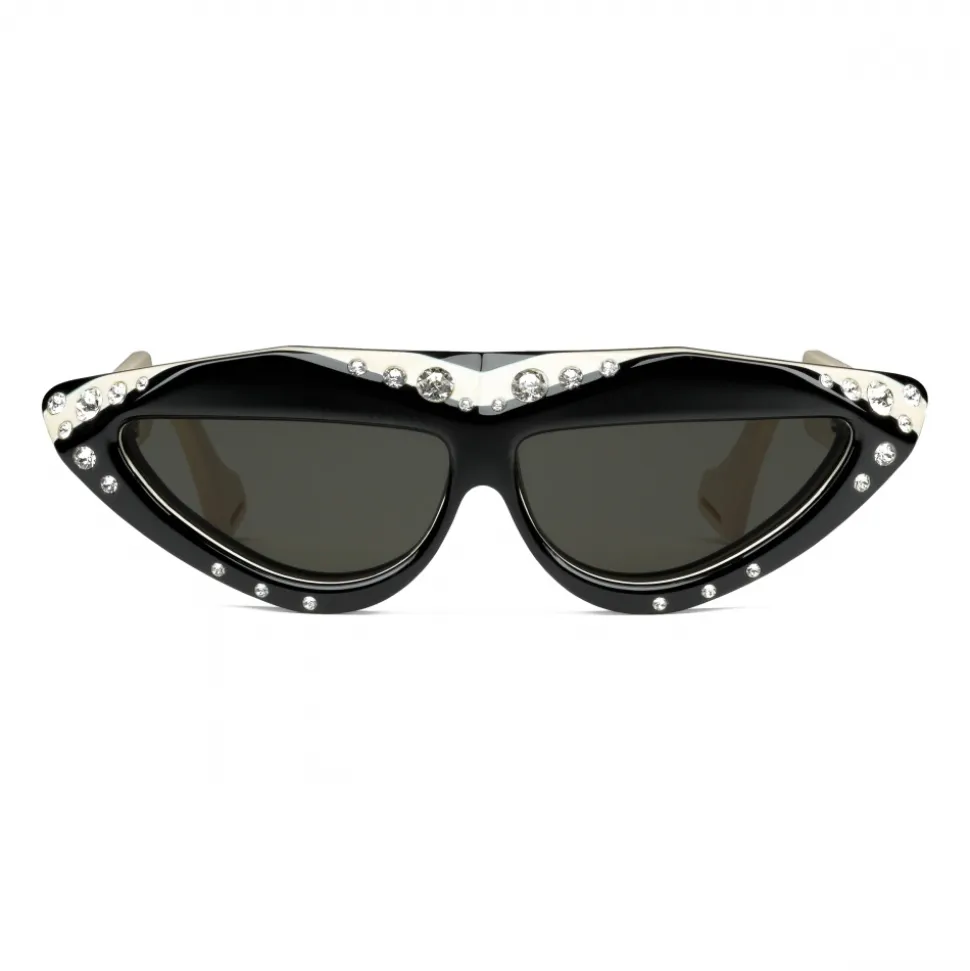 These Hollywood Forever sunglasses are crafted from triple layered, bi-colour acetate and enriched by Swarovski crystals. Rounded edges in contrast colours lighten the geometric frame. A sophisticated play on the classic eyeglass chain, the temple tips feature a cut-out segment that allows the shades to be carried around the neck with a twill neck bow.