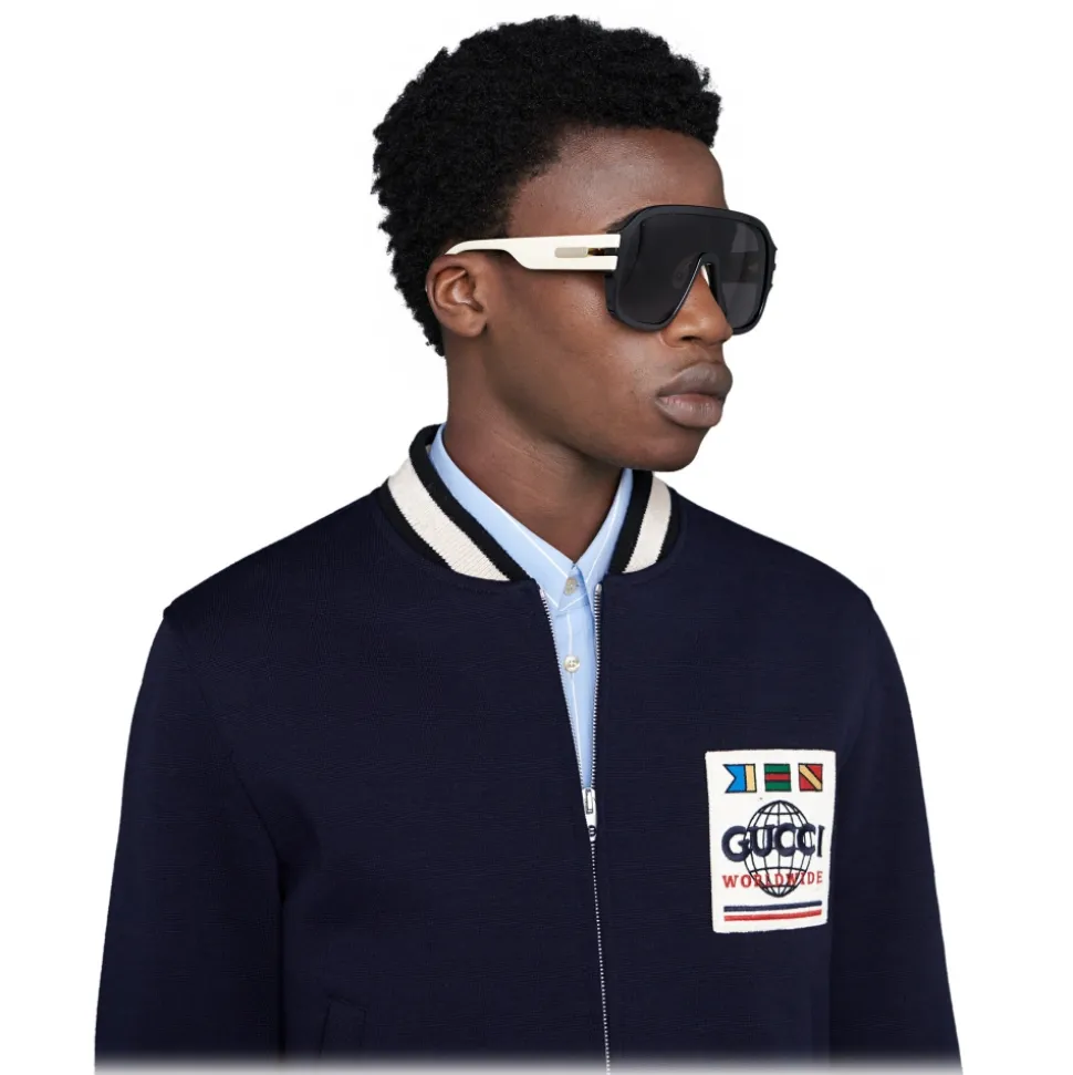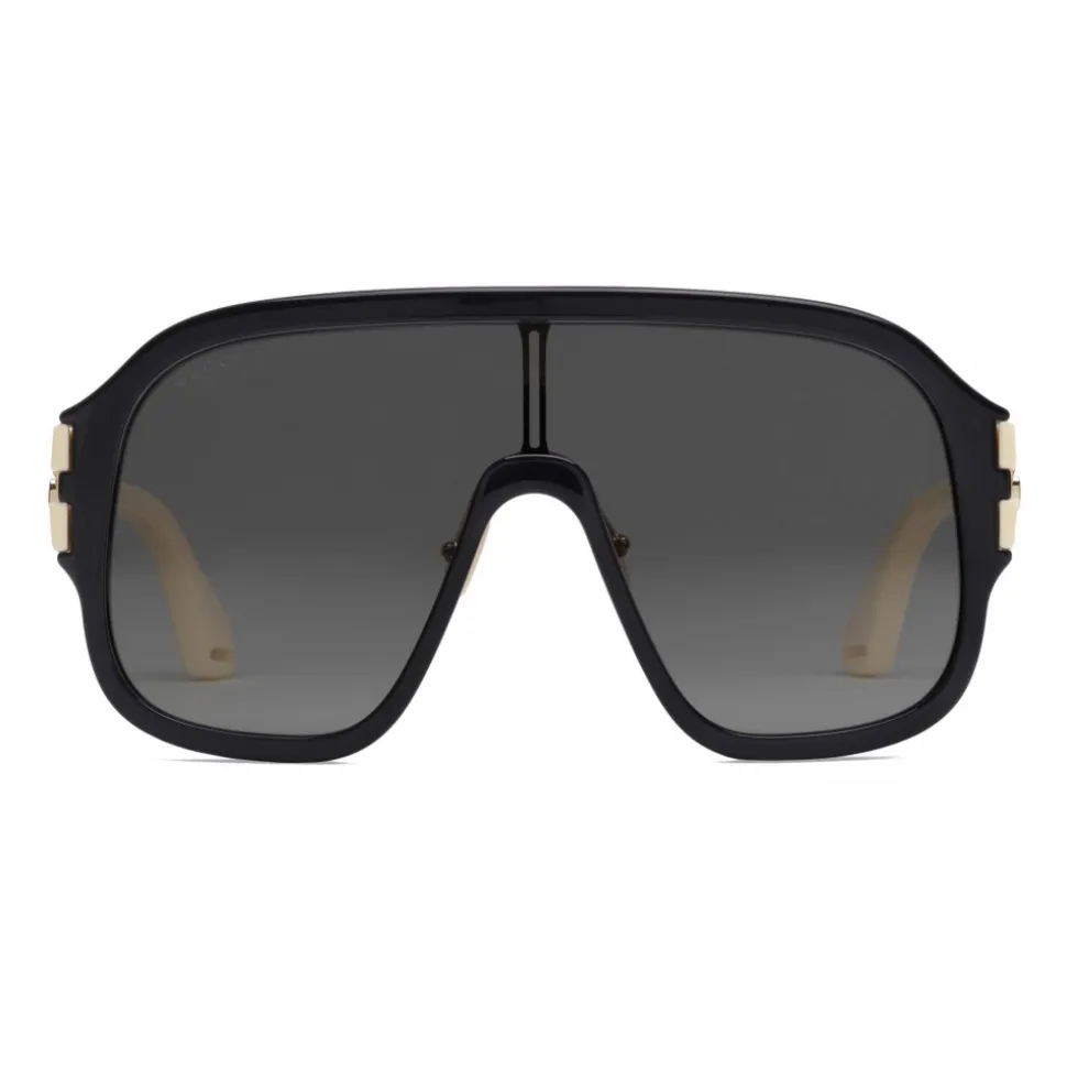 A bold mask design, characterized by a shiny black injected frame and temples is further enhanced by the Gucci script. An unexpected play on the classic eyeglass chain, the temple tips feature a cut-out segment that allows the shades to be carried around the neck with a twill neck bow.