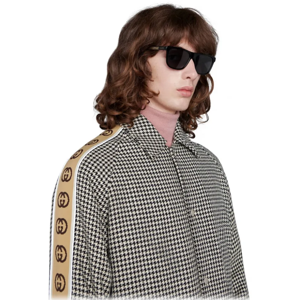 In a mix of materials and volume, these rectangular sunglasses combine a black acetate frame with gold-toned metal temples, embellished with a black varnish detail and the distinctive Gucci script. Black rubber tips add a contemporary feel to the classic shape.