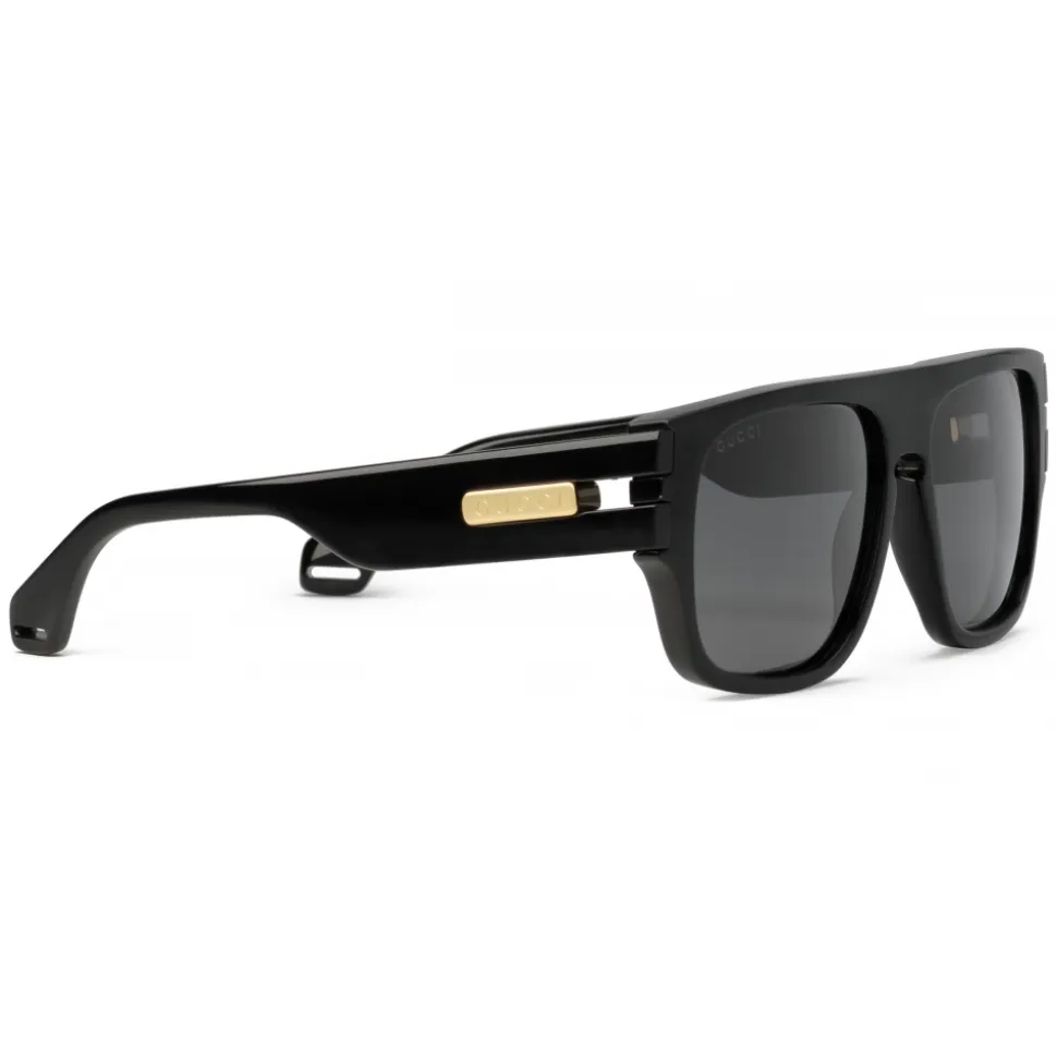 With a rectangular design, these sunglasses are characterized by a shiny black injected frame and temples, further enhanced by the Gucci script. An unexpected play on the classic eyeglass chain, the temple tips feature a cut-out segment that allows the shades to be carried around the neck with a twill neck bow.