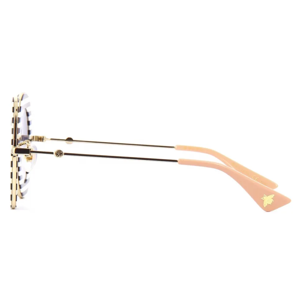 Bold round frames influenced by the popular styles of the 1960s are enriched within the House narrative. The metal-rimmed frames feature striped trims surrounding blue lenses that enhance their retro infused feel. The phrase “Gucci Band” surrounds each lens—a recurring motto of the House that decorates ready-to-wear and accessories.