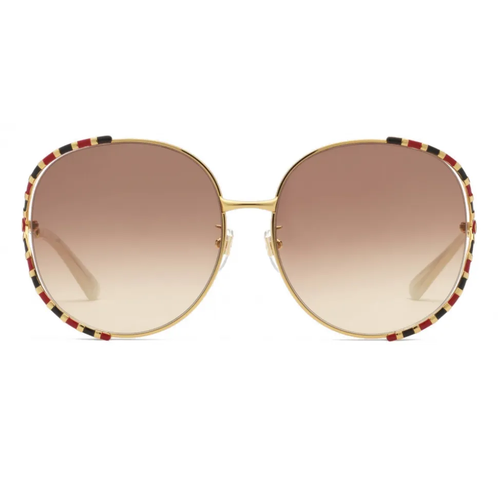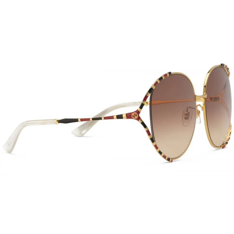 A playful mix of volume and details, the rounded glasses are trimmed with delicate gold-toned metal frame and temples. The pink shaded lenses are complemented by red and black enameled stripe details that frame the sides and continue to the temples, ending in a pearl effect acetate tip. A small Interlocking G detail on each side completes the shape.