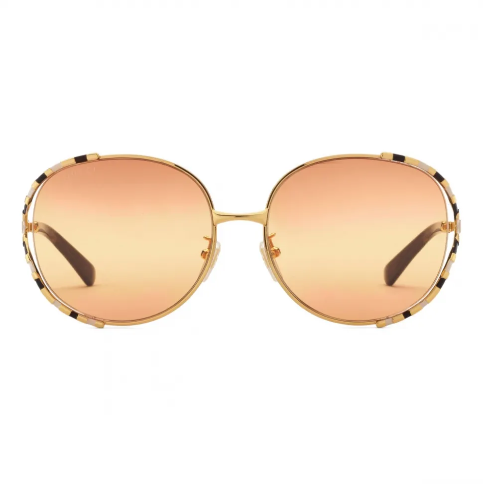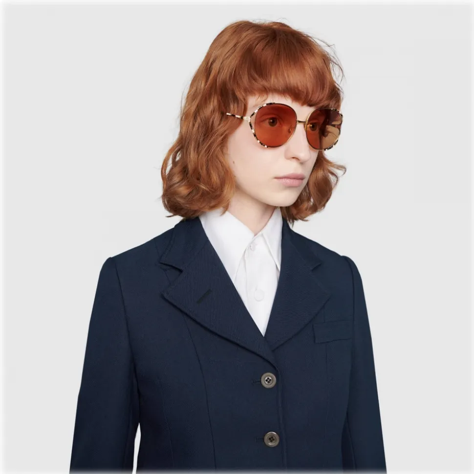 A playful mix of volume and details, the rounded glasses are trimmed with a delicate gold-toned metal frame and temples. The bold orange shaded lenses are complemented with ivory and black enamelled stripe details that frame the sides and continue to the temples, ending in a tortoiseshell acetate tip. A small Interlocking G detail on each side completes the shape.