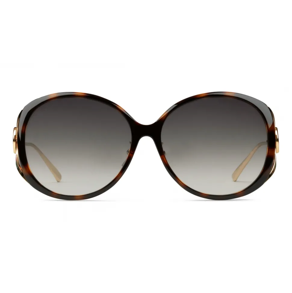 A playful mix of volumes and materials, the feminine round sunglasses feature a wide acetate frame and thin metal temples. An emblematic code of the House, the Interlocking G stands on the round detail finishing the fork shaped temple tips.