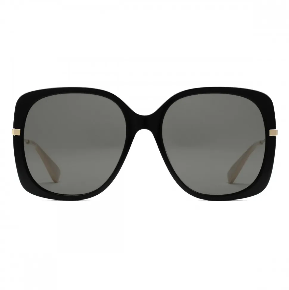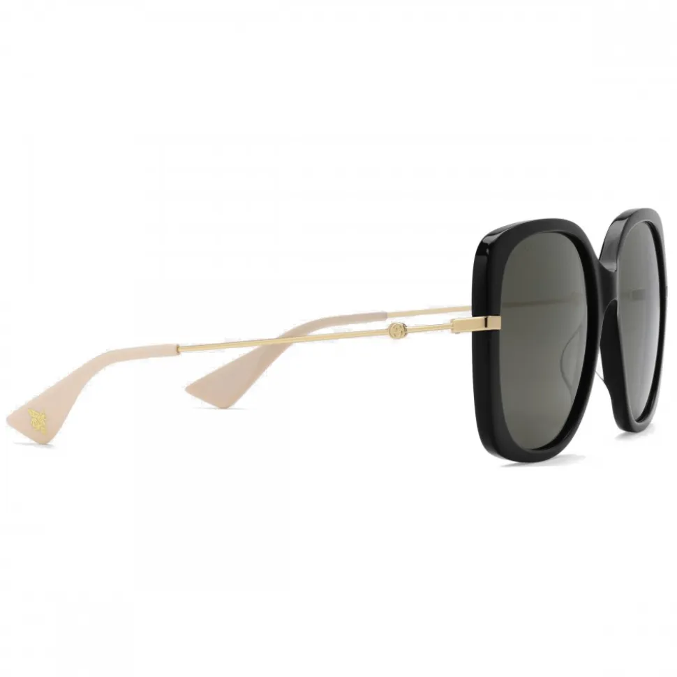 Steeped in a sophisticated allure, these glasses with gray lenses evoke the oversize frames typical of the 70s. The gold-colored metal temples contrast the black acetate frame, while the bee – an archive symbol – decorates the terminals.