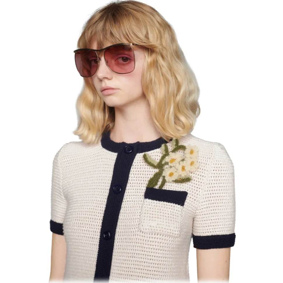 Square-shaped burgundy lenses are framed by thin gold-toned metal with an engraved design that lends texture to the streamlined shape. Slim temples are further enhanced by a petite Interlocking G detail.
