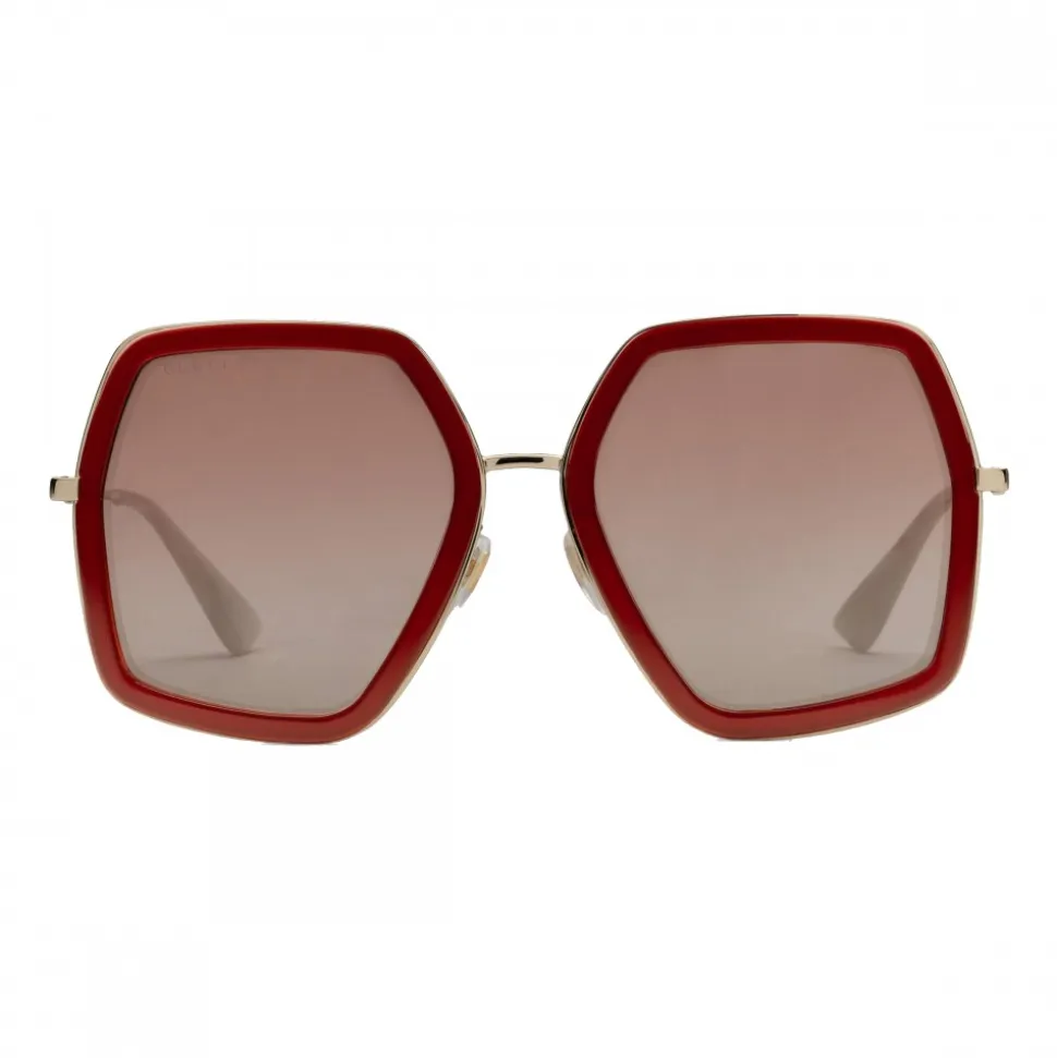 A geometric frame with oversized volumes, which plays with an unexpected mix of gold-colored metal and pink acetate. The metal temples are enriched by mother-of-pearl effect terminals, decorated with the image of a bee – an historic Gucci code from the archives of the 1970s.
