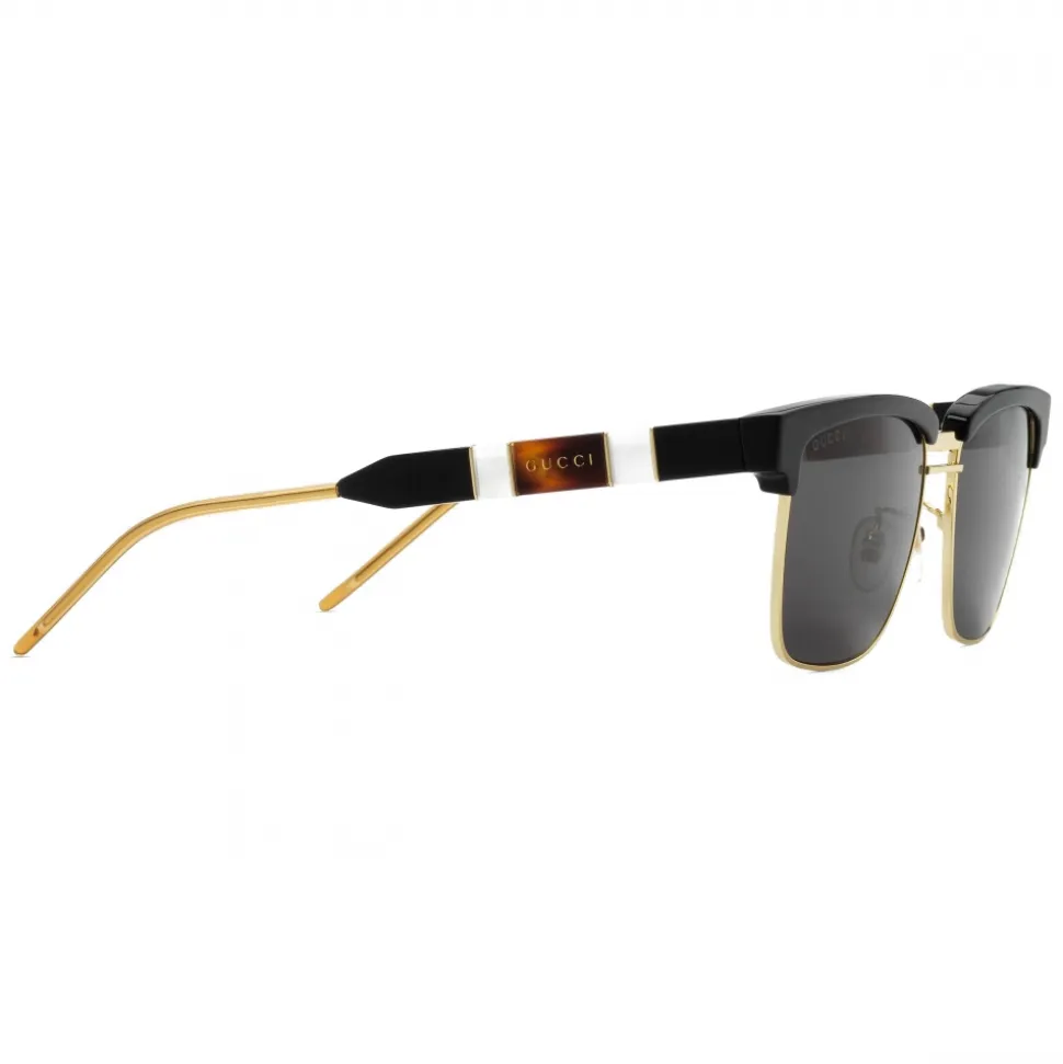 Shiny black acetate temples with gold metal details, and tortoiseshell and mother of pearl effect acetate Web with Gucci script; soft amber acetate coated gold metal tips
