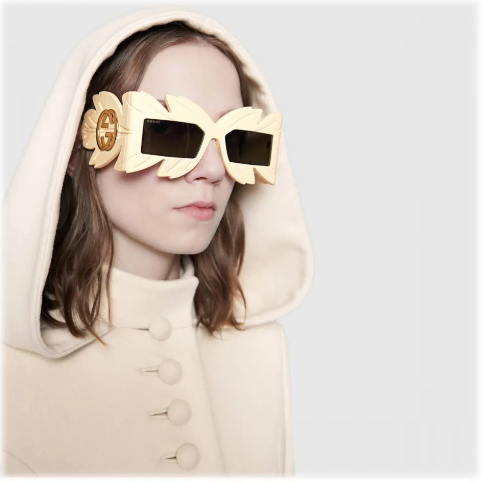 Made of ivory acetate, the handmade frame follows the shape and the typical veins of the leaves. The gold-colored GG detail emphasizes the temples, which end with a silicone-coated metal curl – retro detail that contrasts the oversize volumes of these goggles.