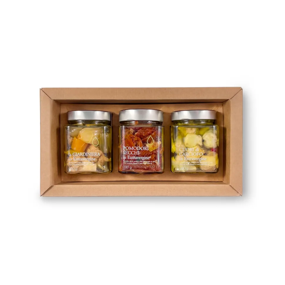 Gift box of in oil in extra virgin olive oil. La Giardiniera, seasoned dried tomatoes and artichoke hearts in extra virgin olive oil.