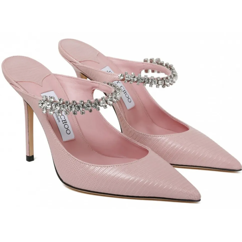 Jimmy Choo Rose Pink Bing Pumps. Rose pink calf leather pumps, lizard skin effect, crystal embellished crossover strap. Pointed toe, branded leather insole, leather sole.