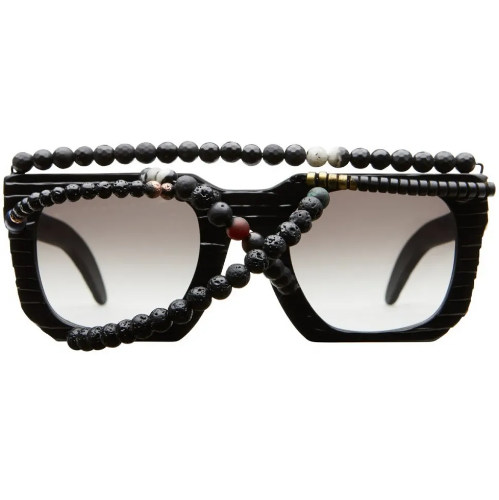 Black deep-dyed acetate frame with handcarved surface finishing, torqoise beats & naturals & bronze coated lava beats