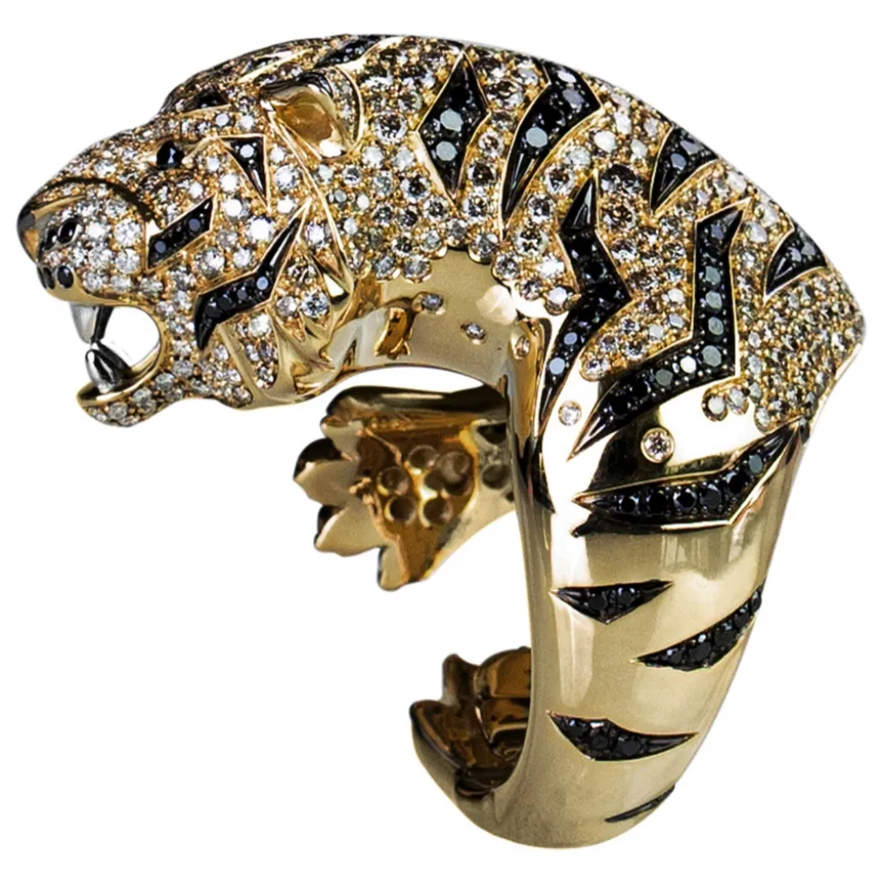 I am La Prima. I wear a tiger, which is a symbol of strength. I take the best from life, that I rule the world. Watching a tiger gives a feeling of wonder. Of supreme beauty. Of royal passage through the land of life. The diamond tiger created by La Prima reproduces the classic tawny colour streaked with black. It is composed of 470 chocolate diamonds and 139 black diamonds that form the characteristic stripes of the fur. The contrast is given by 45 white diamonds. The tiger is your inner strength.