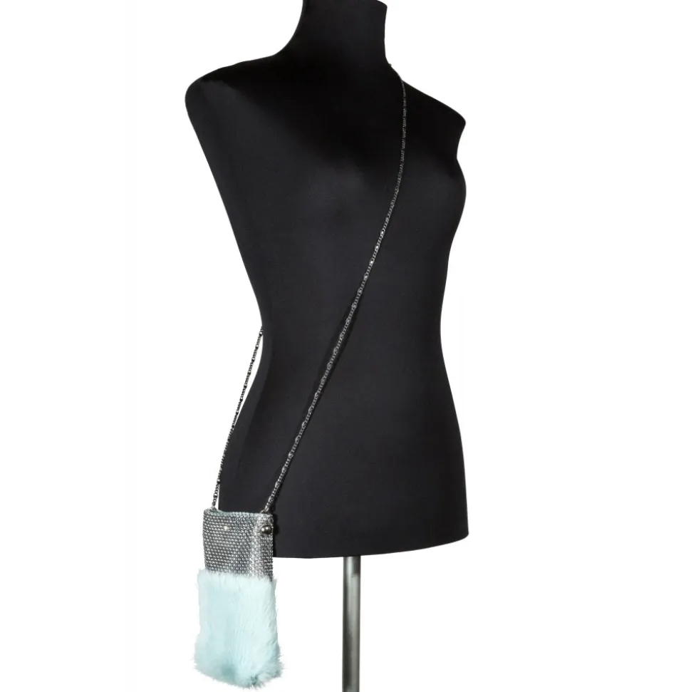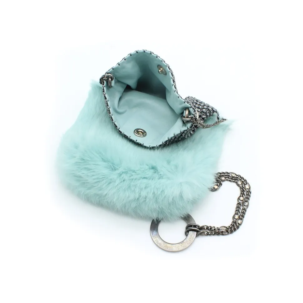 Light blue lapin fur and silver mesh. One blue Swarovski crystal detail. Light blue nappa lining. Snap button closure. 64 cm long silver plated chain strap.