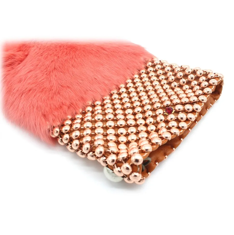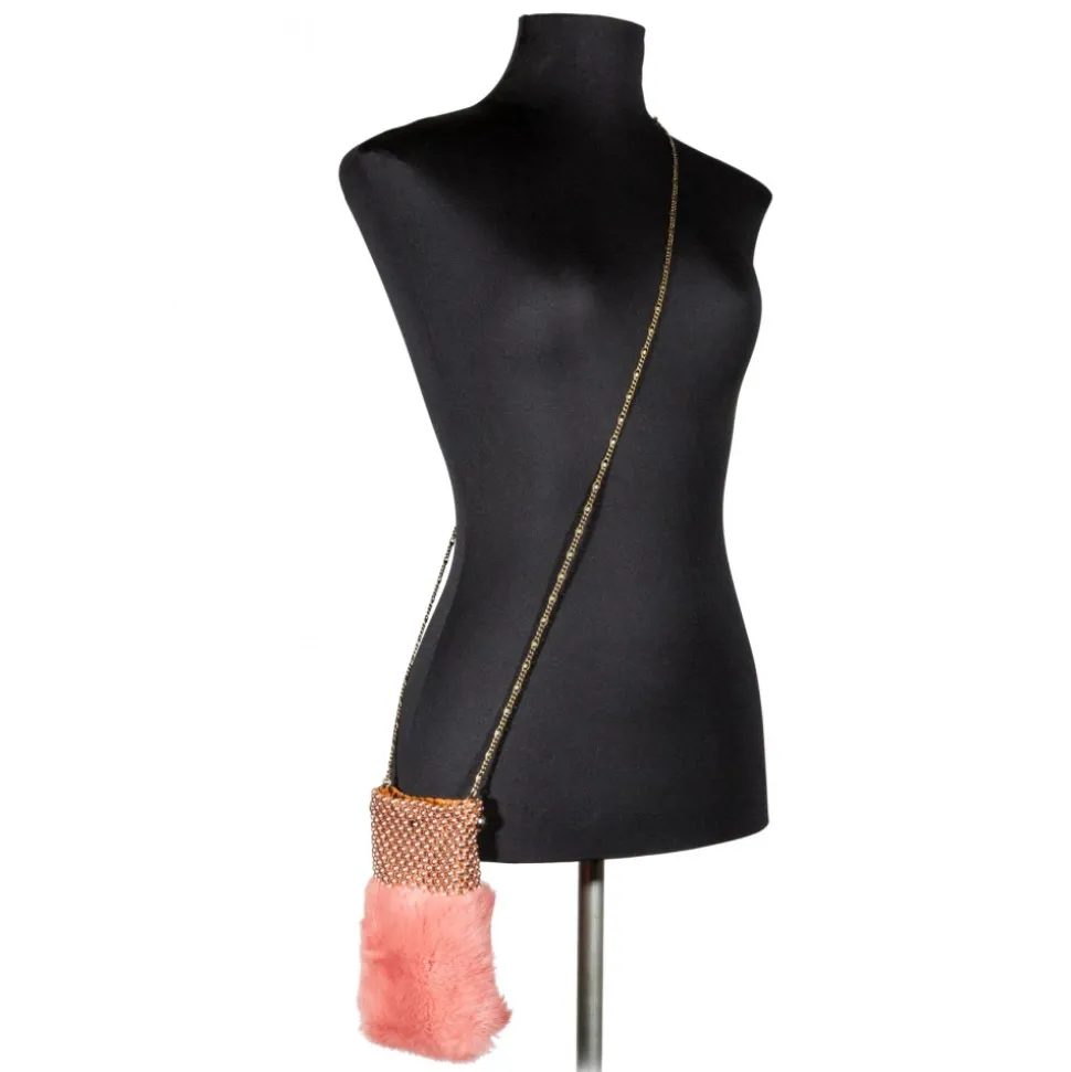 Pink orange lapin fur and copper mesh. One red Swarovski crystal detail. Orange nappa lining. Snap button closure. 64 cm long bronze plated chain strap.