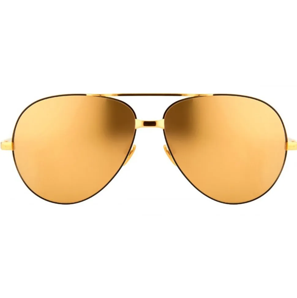 Understated yet luxurious, these unisex Linda Farrow aviators are handcrafted from 22 carat gold-plated Japanese titanium. With co-ordinating gold precious lenses, a slim titanium rim hugs the oval lenses and double bridge of contrasting widths adds unexpected interest.